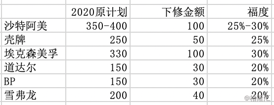 中石化:根据年报披露,2020 年中国石化计划资本支出为1434 亿元,2019年的全年资本支出则为1471亿元,缩减数额为37亿元,同比下降2.52%。根据其初步安排,2020年资本支出在勘探开发、炼油、销售和化工的分配额度分别为611亿元、224亿元、220亿元及323亿元,剩余56亿元则将用于主要用于科研装置及信息化项目建设。2019年的分配情况则为617亿元、314亿元,296亿元以及224亿元,另有20亿元用于科研装置及信息化项目建设。