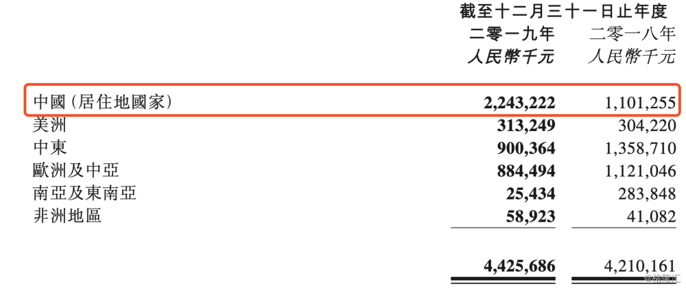 下图是港股宏华集团(00196.HK)收入分布的情况,可以看到公司2019年从中国的收入相比2018年翻了一倍,占整体业绩的比例从25%左右上升到了50%左右。