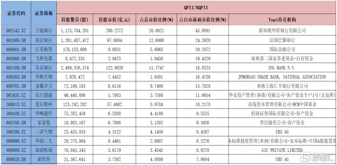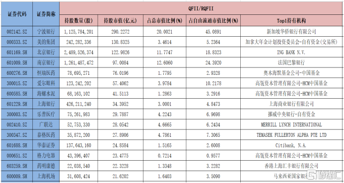 从持仓市值来看,超过百亿元的有宁波银行、美的集团、北京银行。此外,QFII/RQFII持有南京银行、恒瑞医药、爱尔眼科、海螺水泥、上海银行、乐普医疗、广联达的市值也排在前列。