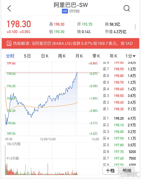 阿里巴巴(09988.HK)翻红 报198.3港元