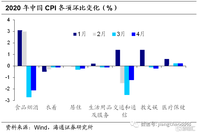 中国3-4CPI环比连续下降,其中食品和交通运输类环比降幅较大,仅医疗保健环比小幅上升。食品项中,鲜菜和猪肉价格环比下降幅度最大。3/4月鲜菜价格环比下跌12.2%/8%,主因复工复产稳步推进,蔬菜大量上市;猪肉环比下跌6.9%/7.6%,主因猪肉供给持续增加。非食品环比持续下跌主要是受国际油价大跌的影响,其中交通运输类影响最为显著。唯一上涨的类别为医疗保健,3月和4月环比均微升0.2%