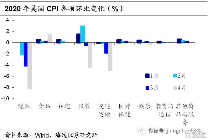 美国4CPI3月进一步下滑,主要受能源价格拖累。美国CPI连续两个月下滑,剔除季节性因素,3/4月分别下滑0.4%/0.8%。受国际油价大跌影响,能源价格和交通运输价格连续3个月环比下行,其中4月分别环比下降8.3%/5%。由于疫情造成食品部分供应链中断以及消费者囤货导致的供需失衡,4月食品价格环比上升1.5%。剔除食品和能源后的核心CPI4月环比降0.5%,创1957年以来最大月环比降幅。