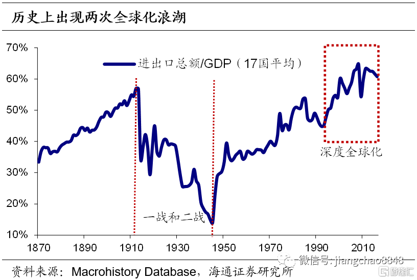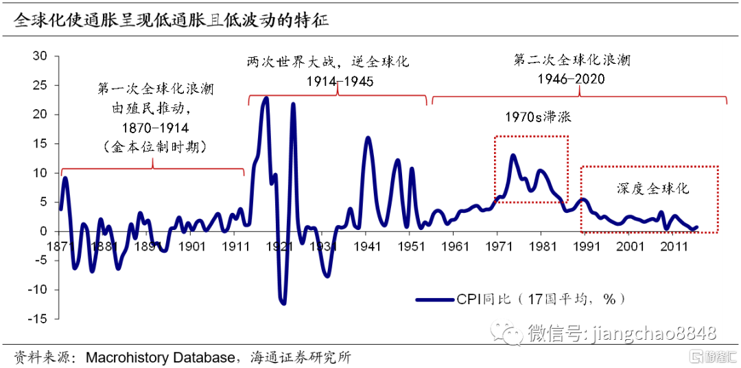 全球化使通胀呈现低通胀且低波动的特征。根据进出口总额占GDP比值变化可以判断1870年以来出现过两次全球化浪潮。第一次起于1870年,由殖民推动,结束于一战的爆发。二战后,第二次全球化浪潮开启。从历史数据来看,全球化使通胀呈现低通胀且低波动的特征。主要原因为:1)全球化使产业链生产成本最低且最有效率,有效降低贸易品价格;2)全球化使竞争加大,价格产生下行压力;3)全球价值链延伸,各国之间投入产出关联增强。国家间的过剩产出与过剩需求可通过国际贸易重新分配。张步昙(2015)研究显示,国外产出缺口对一国通胀驱动作用逐渐超过传统理论中的国内产出缺口。新兴市场国家本国价格水平变动更多归因于国际市场的供需,而工业化国家则受益于廉价供给,通胀持续趋缓。