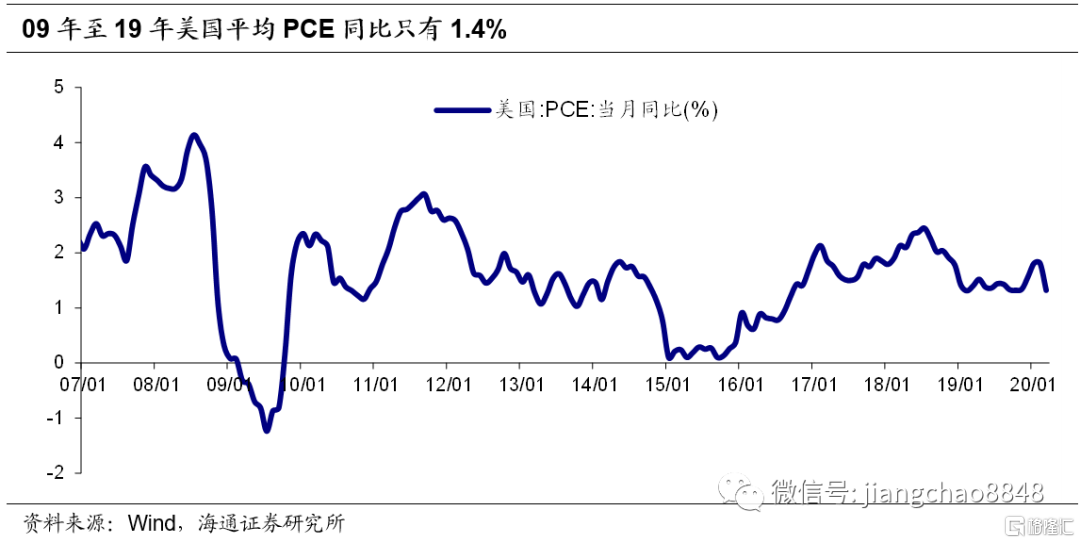 次贷危机爆发后,美联储采取了一系列措施为市场注入流动性,并从0811月起,先后开启了三轮量化宽松。美联储的资产负债表因此快速膨胀。088月美联储的总资产为9052亿美元,到1410月退出QE3时,资产已达4.5万亿美元。但是这一系列货币超发并没有带来大规模的通胀。事实上,09年至19年,美国的平均PCE同比只有1.4%,甚至低于美联储2%的目标通胀率。