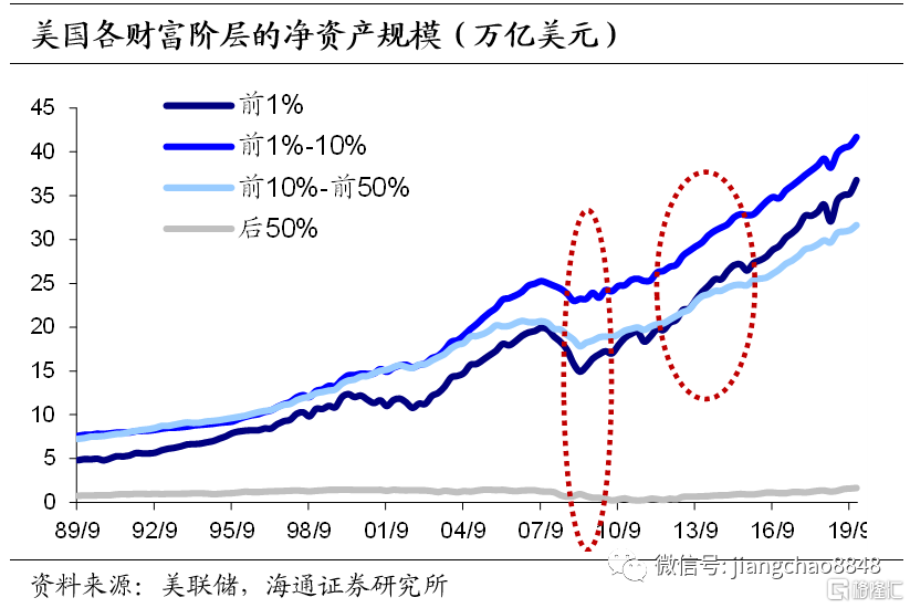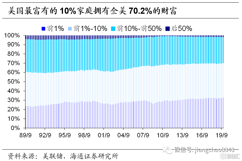 货币宽松背景下,过剩流动性催生资产泡沫,进一步增大贫富差距。次贷危机后的货币宽松催生了美国长达十年的大牛市。美国标普500指数从09年最低的667点上涨到20202月最高3393点,最高涨幅超过400%。富人享有了股市上涨的绝大部分红利。在20093月,美国最富有的10%的家庭就拥有美国所有权益类财富的83%。美国持续10年的大牛市使富人的资产急剧上升,到201912月,前10%的家庭的权益资产比例占比提高到88%