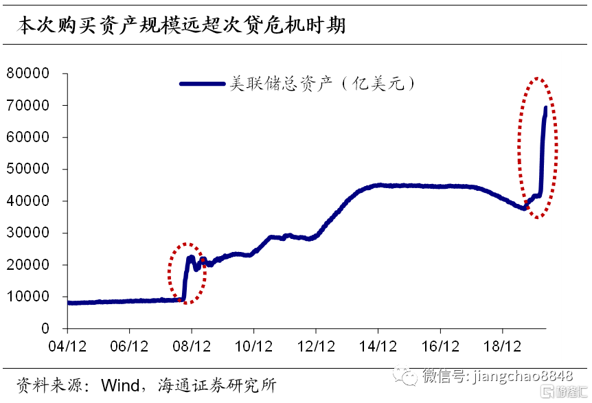 面对新冠疫情,美联储打出“组合拳”,力度远超次贷危机时期。美联储采取了极为宽松的非常规货币政策:2020315日美联储直接祭出零利率和7000亿美元QE323日宣布QE无上限;3 26日将存款准备金率降为049日宣布将提供2.3万亿美元的贷款帮助家庭和企业。组合拳下,当前美国广义货币M2增速已经超过20%,接近1943年创下的26%的历史峰值。从311日到513日的短短的两个月的时间,美联储的资产规模从4.3万亿美元跃升到6.9万亿美元,增幅60%。与此形成鲜明对比的是,088月底到12月底这四个月时间,美联储的资产仅增加1.3万亿美元,增幅46%