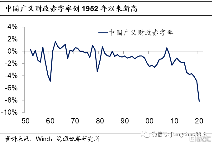 广义财政赤字率攀升。我国财政政策与08年应对金融危机时相比,更为收敛。522日的政府工作报告指出,预计全年为市场主体新增减负将超过2.5万亿元。资金筹集方面,将赤字率从2.8%提高至3.6%以上,新增1万亿抗疫特别国债,新增的财政赤字和特别国债全部安排给地方,缓解地方行政困难。专项债较去年新增1.6万亿,有效支持补短板、惠民生、促消费、扩内需。可见今年政策重点在纾困而非刺激。报告未提及经济增长目标,为未来的经济发展留下更多余地。根据两会预算报告,预计实际财政赤字总额为6.8万亿、政府基金收支赤字为4.45万亿,预计今年从政府性基金向公共财政调入资金约3万亿,从而使得预算财政赤字降至3.76万亿,以实现3.6%的名义财政赤字率。扣掉这部分重合之后,今年的广义财政赤字总额约为8.5万亿,对应广义财政赤字率约为8.2%,创下1952年以来的新高。