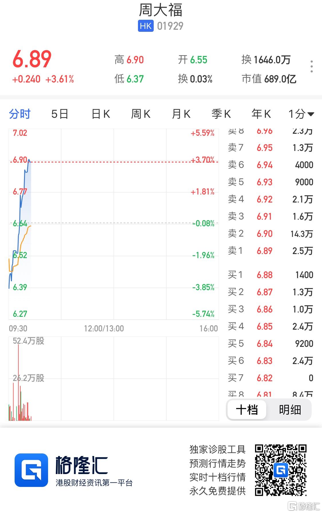 港股异动 | 周大福(1929.HK)急涨至3.61% 国内销售逐步回稳
