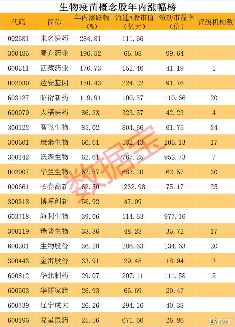 新冠疫苗概念总龙头当属未名医药。未名医药因参股国内知名疫苗研发企业——北京科兴系公司,股价大幅飙升。公司也在深交所互动平台多次表示“参股公司北京科兴正在开展新冠肺炎疫苗的研制工作”。截至最新,公司股价年内涨幅超过284%。