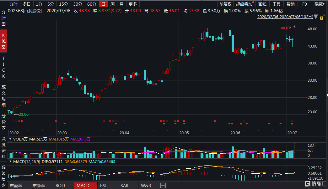 格隆汇7月6日丨百润股份(002568.SZ)现报48.38元,涨幅8.33%,最新总市值251亿。公司7月3日发布2020年半年度业绩预告,归属于上市公司股东的净利润预计为盈利2.05亿元—2.19亿元,同比增长50%-60%。主要系公司预调鸡尾酒业务产品销售情况良好,经营利润相应增加所致。
