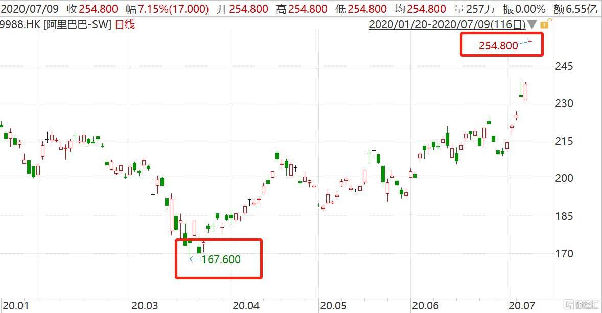 格隆汇7月9日丨阿里巴巴(9988.HK)跳空高开7.15%报254.8港元,创上市新高价,盘前成交6.55亿港元,最新总市值5.46万亿港元,超越腾讯重回中国最大市值公司。隔夜美股阿里巴巴(BABA.US)收涨8.95%报257.68美元,创历史新高,换算成港股市场价格为249.63港元/股。阿里巴巴入选了格隆汇2020年“下注中国十大核心资产”名单。美股阿里巴巴股价自3月23日低点上涨至今最大涨幅达52%,港股阿里巴巴自3月19日低点上涨至今最大涨幅达52%。