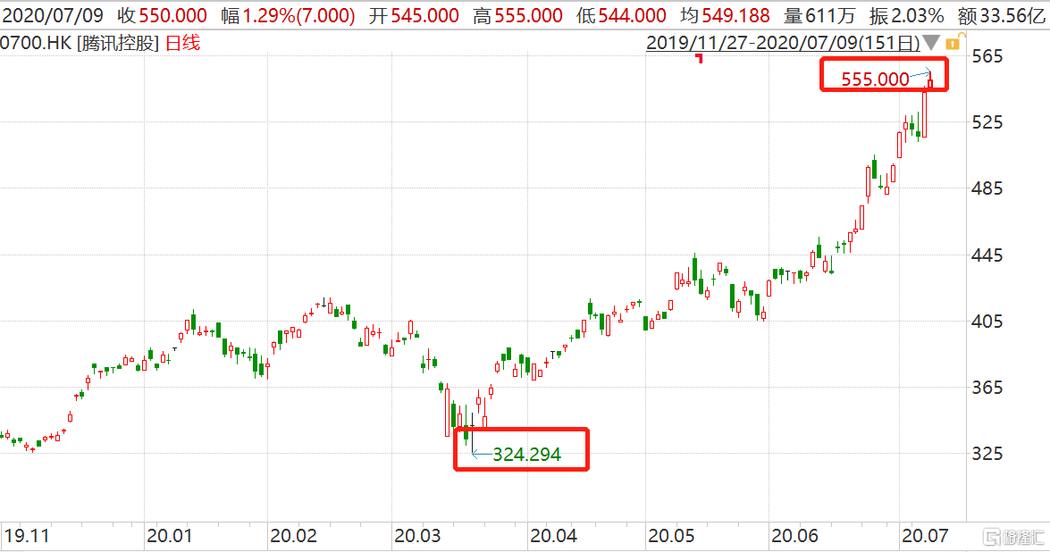 格隆汇7月9日丨腾讯(0700.HK)今日盘中再创历史新高价555港元,市值一度突破5.3万亿港元。腾讯入选了格隆汇2020年“下注中国十大核心资产”名单。该股自今年3月19日上涨至今最大涨幅达71%。
