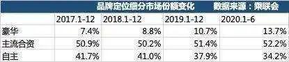 此外,主流合资品牌的市场份额较为稳定,2017年至2019年分别为50.9%、50.2%、51.4%,今年上半年的市场份额为52.2%。