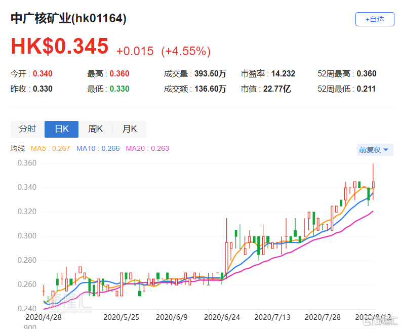 格隆汇8月12日丨中广核矿业(01164.HK)涨4.55%,报0.345港元,盘中高见0.36港元刷新近一年来新高,总市值22.77亿港元。中广核矿业昨日公告,公司预期截至2020年6月30日止6个月纯利较2019年同期将录得30%至50%的增长。纯利增长主要因为天然铀贸易毛利及应占合营企业业绩较2019年同期有大幅增长。