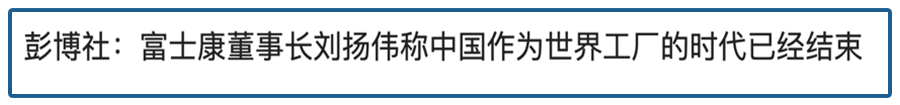 彭博社报道了富士康董事长的发言,说苹果公司的供应商们已经在准备把中美之间的供应链分开了,连富士康都已经在海外加仓了,海外生产力从25%提升到了30%,总之,富士康认为中国已经丢失了世界工厂的地位。