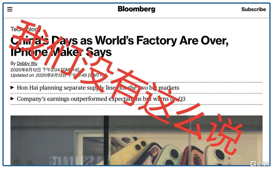 被喷了的富士康,求生欲还是很旺盛的,第一时间出来反驳,“我们没有这么说”,彭博自己过度解读,曲解误导。