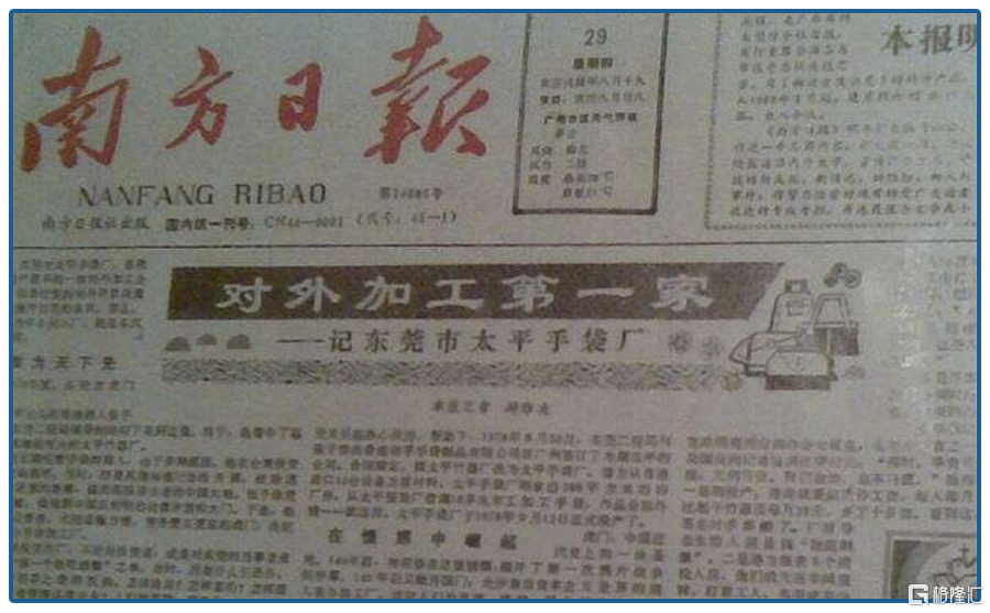 1978年9月15日,东莞太平服装厂与濒临倒闭的香港信孚手袋合资的太平手袋厂,拿到了工商总局发的“粤字001号”的执照,港商张子弥松了口气,他在手袋厂终于有救了,从前因为人工和地价的上涨而行将倒闭的工厂,在东莞焕发了第二春。