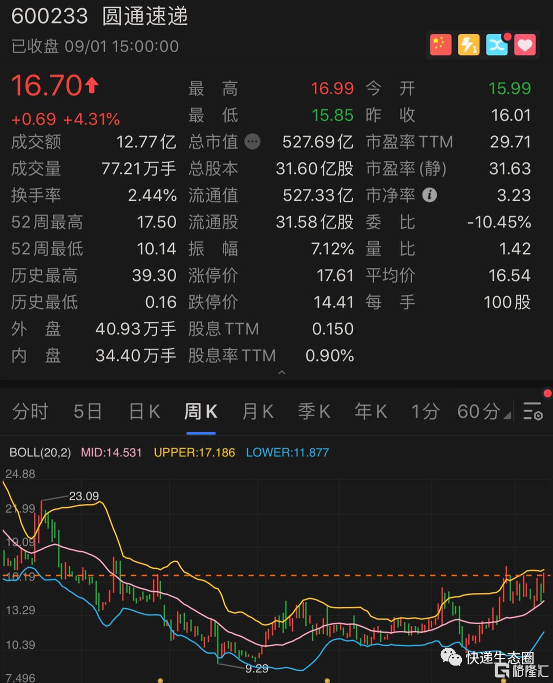提醒朋友们注意的是,明天的圆通速递(600233.SH)股价走势就极为关键,假设一字板涨停,是绝对不能打开的;如果打开了,朋友们就需要注意了....