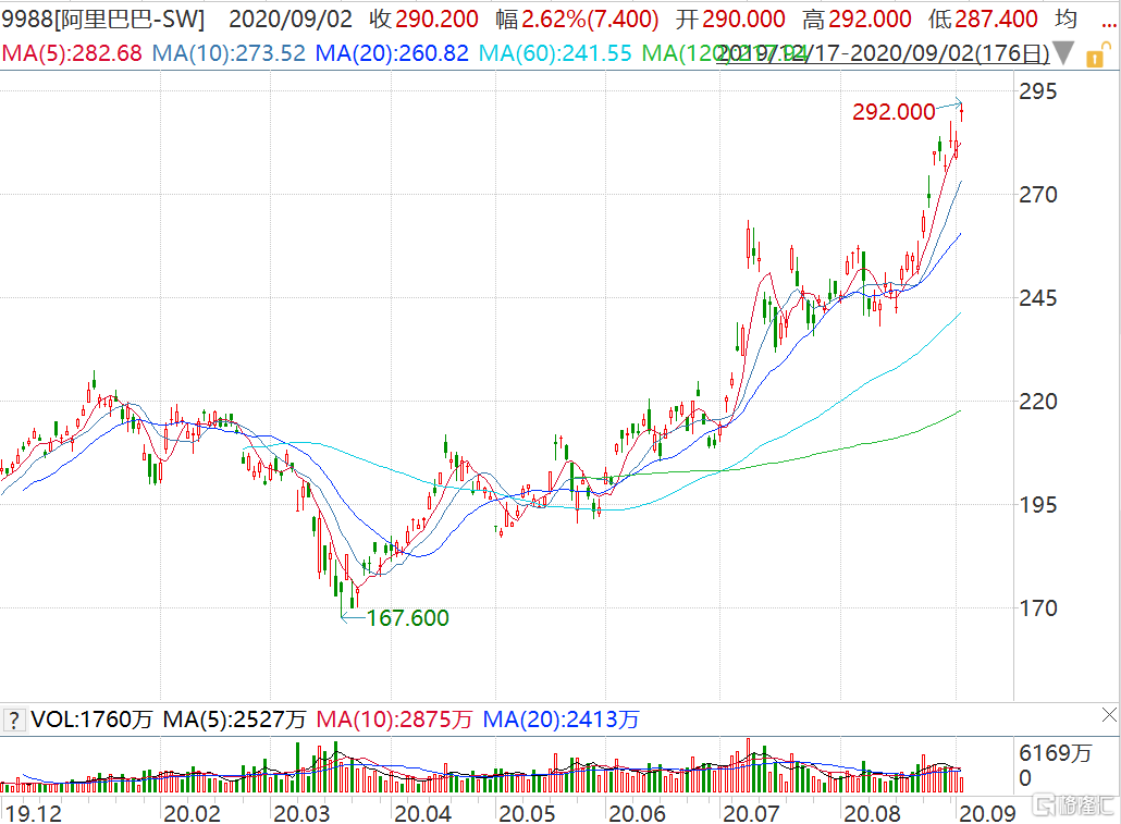 阿里巴巴(9988.HK)站上290港元关口再创新高 市值超6.25万亿港元
