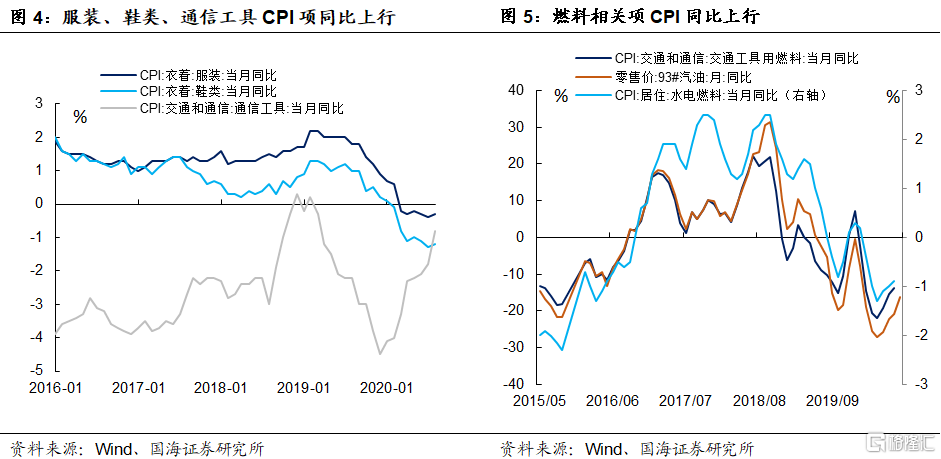但在商品项目中,服装、鞋类、通信工具CPI项同比增速上行,相关商品需求出现好转迹象。另外,8月份原油价格继续走高,带动交通工具用燃料、水电燃料项目增速上行。