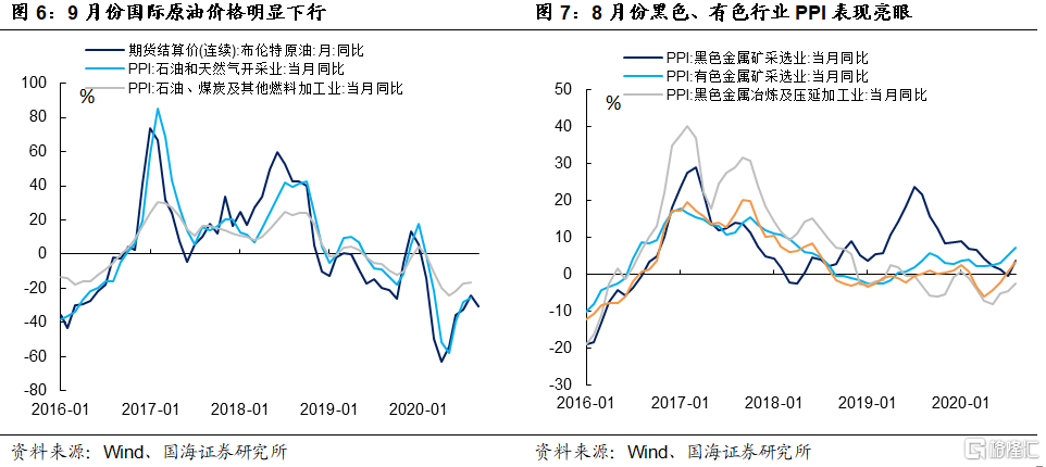 PPI方面,8月份国际原油价格环比继续上行,带动石油相关产业PPI持续改善。但进入9月份后,国际原油价格明显回调,将打断持续6月份以来石油相关产业PPI的回暖势头。