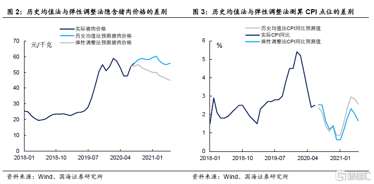 假设猪肉价格在中秋节前的9月达到周期性高点60元/千克,此后逐步回落。2021年春节后,猪肉价格回落至50元/千克,年中回落至45元/千克。根据计算,2021年春节后CPI依旧延续上行趋势,但在2021年5月份阶段性高点,CPI同比为2.3%,较历史均值法计算结果低0.7个百分点。(若猪价回落至50元/千克,对应5月CPI为2.6%)