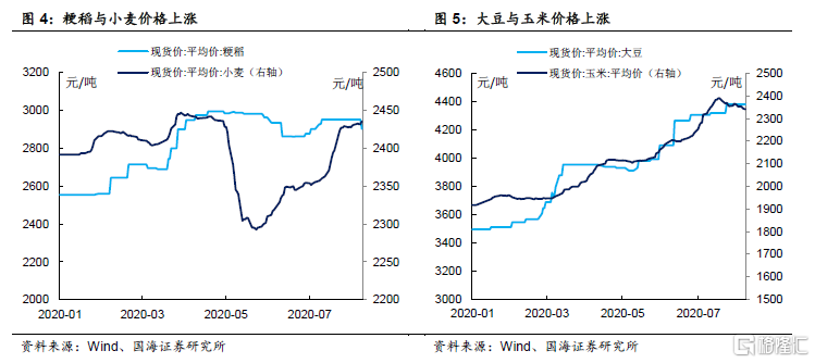 疫情及南方大雨之后,小麦、粳稻等主粮与大豆、玉米等饲料粮价格均出现了一定程度的上涨,引发了市场对于粮食通胀超预期的担忧。