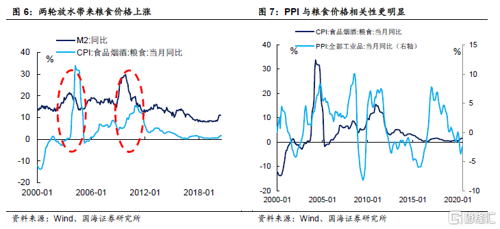 从主粮涨价的路径来看,历史上货币宽松、或者M2的上行,一定程度与后续粮食价格的上涨有相关性。但粮食价格上涨的根本原因,还是在于PPI的上行,并抬升主粮的种植成本(种子、农机使用、化肥等),因此数据上PPI与粮食价格的正相关性更加明显。