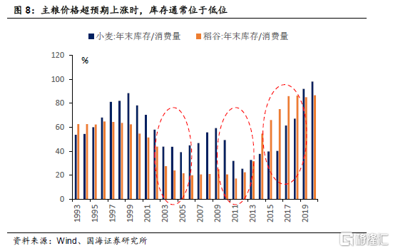 虽然PPI上行会引发粮食价格的上涨,但其上涨幅度,还取决于政府平抑价格波动的能力,即主粮库存。主粮库存均处于历史低位时,政府平抑价格波动的能力有限,粮商囤积行为会放大粮食上涨幅度(2003、2009)。主粮库存高企时,政府有能力控制粮食价格,主粮价格超预期上涨的可能性很小(2017年)。