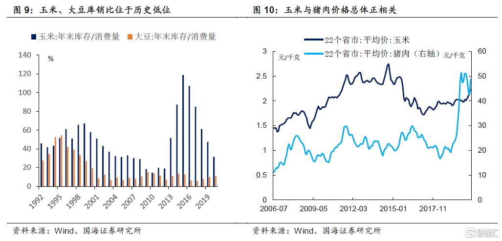 从饲料粮涨价的路径来看,当前玉米、大豆等饲料粮库存位于历史低位,的确存在超预期上涨的可能性。饲料粮涨价,理论上可以通过提高生猪养殖成本,向CPI猪肉项传导。