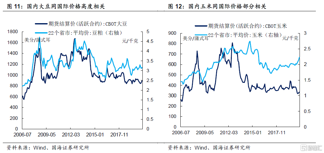 相较于主粮,我国大豆80%以上依靠进口,玉米市场化定价后,其价格走势也与外盘也较为相关。当前国际地缘政治动荡,极端天气风险频发,大豆、玉米国内外价格超预期上涨的风险较大。