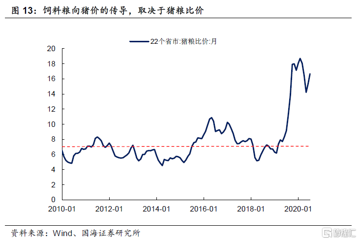 但在另一方面,从饲料粮向猪价的传导,仍需分情况讨论。理论上猪粮比位于高位时,生猪养殖利润会部分吸收饲料粮价格上涨带来的冲击,导致饲料粮价格向猪肉价格的传导不畅。