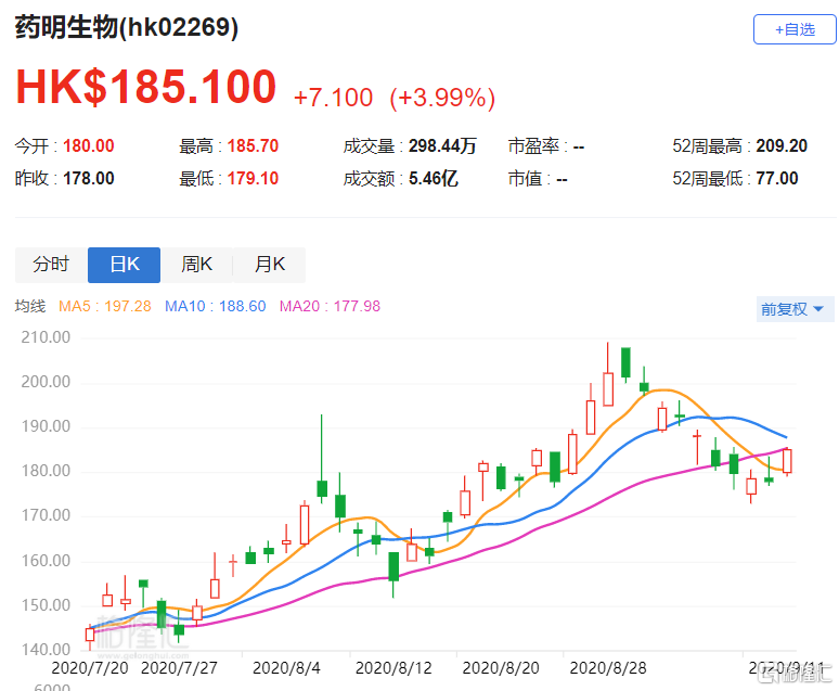 格隆汇9月11日丨本周一起正式“染蓝”的药明生物(2269.HK)终止由历史高位九连跌,现涨近4%领涨恒指成份股,报185.1港元。美银证券发研报指,疫情下药明生物上半年业绩仍带来惊喜,保持强劲增长,产能利用率提高推动利润提升。该行将2020至2022年每股盈利预测提升至1.37、2.07及3.04元人民币,目标价由116港元调高至200港元,并重申“买入”评级。瑞银发表报告指,虽然业务环境艰难,但药明生物(2269.HK)在今年上半年仍签署了38个新项目(早前指引为20个),令集团上半年收入及纯利表现均优于预期。该行上调药明生物股份目标价,由167港元升至227港元,维持“买入”评级