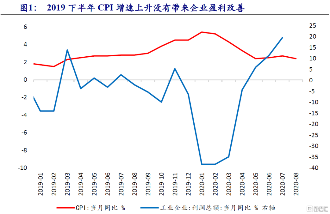 8月,中国PPI同比增速从7月的-2.4%回升至-2%,同时CPI同比增速从2.7%下降至2.4%,下半年翘尾因素减弱,CPI增速将趋势性下降。一般认为,CPI增速和下游企业利润密切相关,CPI增速下行,下游企业利润将受到负面冲击,但是这需要具体问题具体分析。2019年下半年猪肉价格飙升,拉升了CPI增速,但是这只改善了养殖企业的利润增速,对其他行业的利润增速影响并不大。同样地,2020年CPI增速下滑,是由于猪肉价格的高基数效应,这对养殖企业利润的负面冲击较大,但是对其他行业利润影响不大。