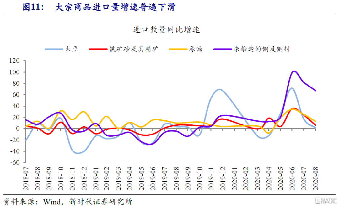 海外疫情影响下,8月美元计价进口金额同比下降2.1%,降幅较前值-1.4%进一步扩大,进口弱于市场预期。分区域来看,从美国、日本、韩国、印度的进口额增速分别回落2.2、6.0、5.6、30.8个百分点,从欧盟、东盟的进口额增速回升5.1和0.4个百分点,从欧盟的进口额同比增速仍为负值。分产品来看,多种商品进口呈现量增价跌,大豆、铁矿砂及其精矿、原油、未锻造的铜及铜材进口量分别上升1.3%、5.8%、12.6%、67.1%,进口量的增速均较前值放缓,虽然国内内需在修复,但是海外疫情仍然比较严重,限制了生产、交货。另外,原油价格同比上涨,原油进口额降幅收窄,而大豆、铁矿砂及其精矿、原油、未锻造的铜及铜材受价格拖累,进口额同比增速均下降至负值。