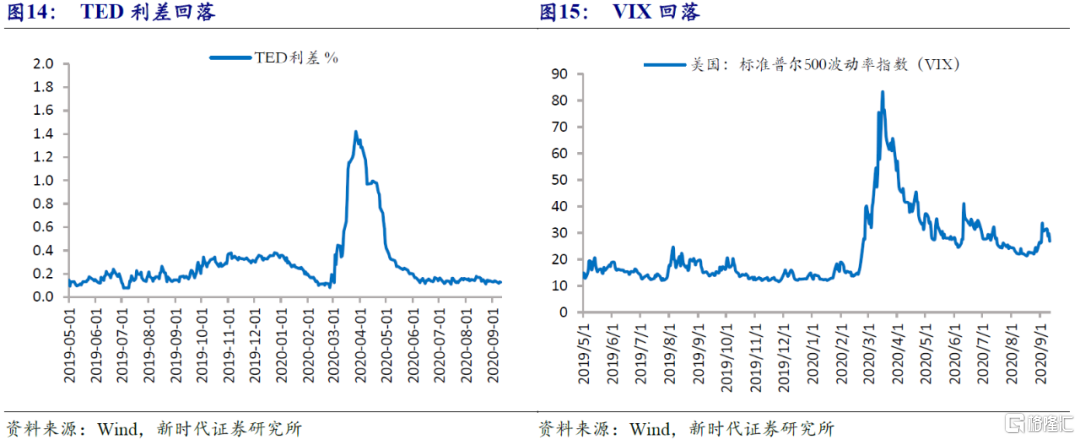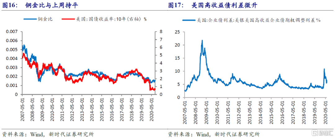 上周美国金融市场恐慌情绪缓解,VIX回落至26.9。流动性压力缓解,Ted利差下降。美国信用风险小幅上升,高收益企业债利差从5.13%升至5.16%。