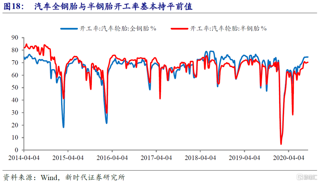 上周,生产指标分化,整体缓慢修复。高炉开工率为70.2%,较前值下降了约0.8个百分点,100家焦化企业开工率为75.3%,较前值上升了约1个百分点。汽车全钢胎与半钢胎开工率基本与前值持平。