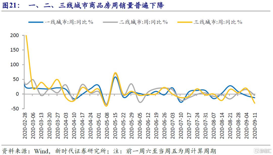 上周,30大中城市商品房日均成交面积为52.0万平方米(前一周六至周五为计算周期),较前一周61.8万平方米大幅下降。30大中城市商品房成交面积周同比增速从11.1%回落至-15.9%,其中,一、二、三线城市商品房销售面积同比增速均出落,分别为-12.6%、-3.9%、-31.1%。