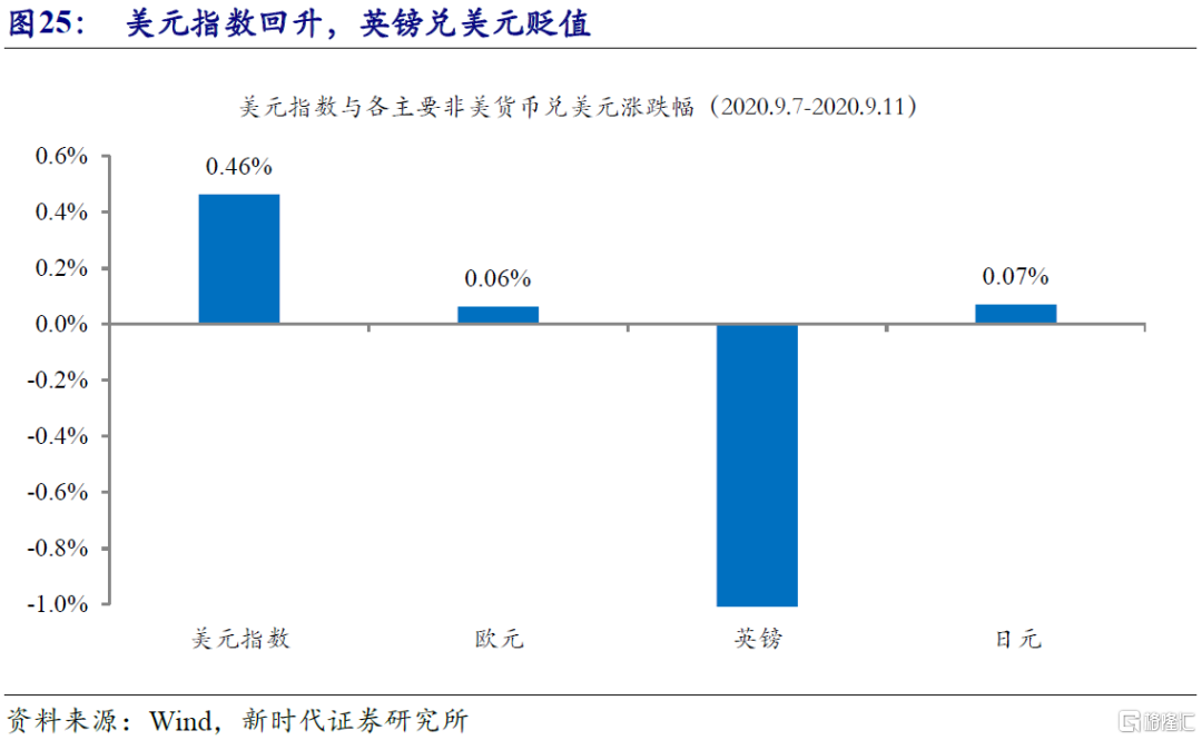 上周,美元小幅修复,美元指数上升0.5%至93.25。非美货币方面,欧元和日元兑美元分别升值0.06%和0.076%,受英国脱欧谈判影响,英镑兑美元大幅贬值3.6%。人民币兑美元汇率小幅升值0.04%。
