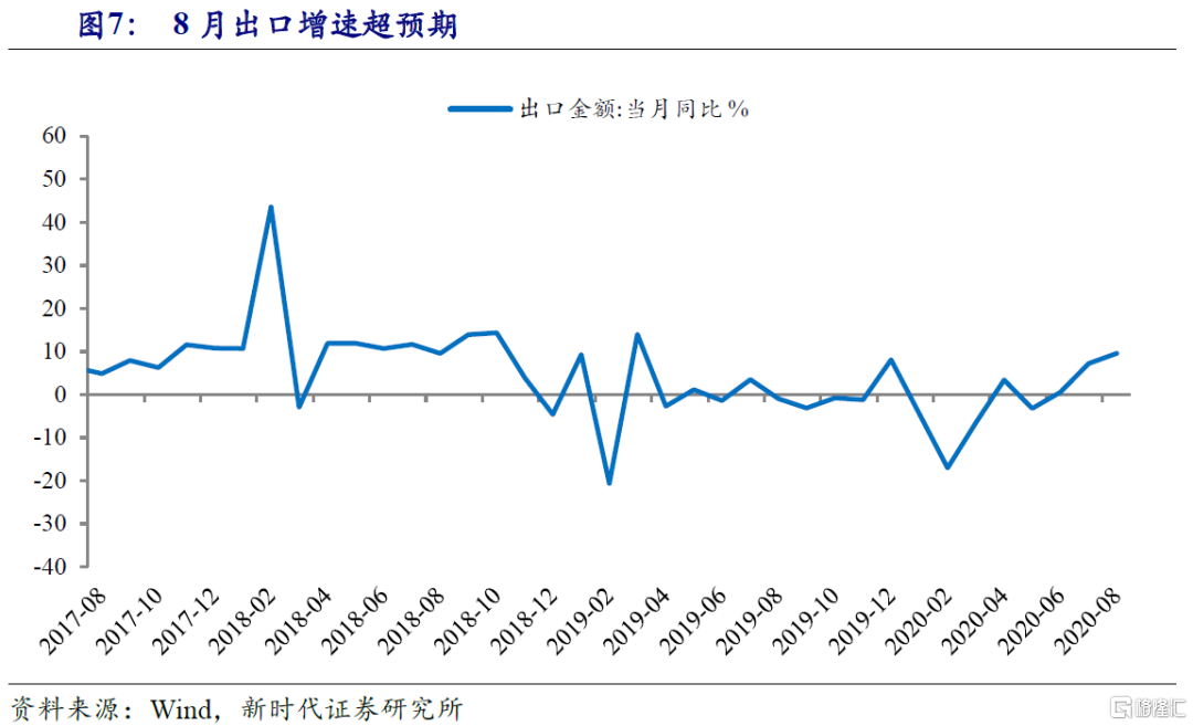 防疫物资出口增速进一步下滑,生产生活物资出口增速上升。海外疫情持续,防疫物资出口需求仍然旺盛,但增速已持续放缓。8月与防疫物资相关的医疗仪器及器械、纺织纱线织物及制品出口分别同比增长38.9%、47.0%,但是增速较前值78.0%、48.4%均进一步下滑,防疫物资出口对出口的拉动在减弱。随着海外经济解封,生产生活物资需求增加,且与宅经济相关的生产生活物资需求旺盛。7月中国高新技术产品与机电产品出口均同比增长11.9%,前者增速较前值的15.6%有所回落,后者增速较前值10.2%上升。劳动密集型产品中,家具出口增速继续维持在较高水平,增速为24.0%,较前值23.1%小幅上升,服装出口增速为3.2%,扭转了疫情以来持续数月的负增长情况,部分反映出海外生活恢复常态下服装需求的回升。