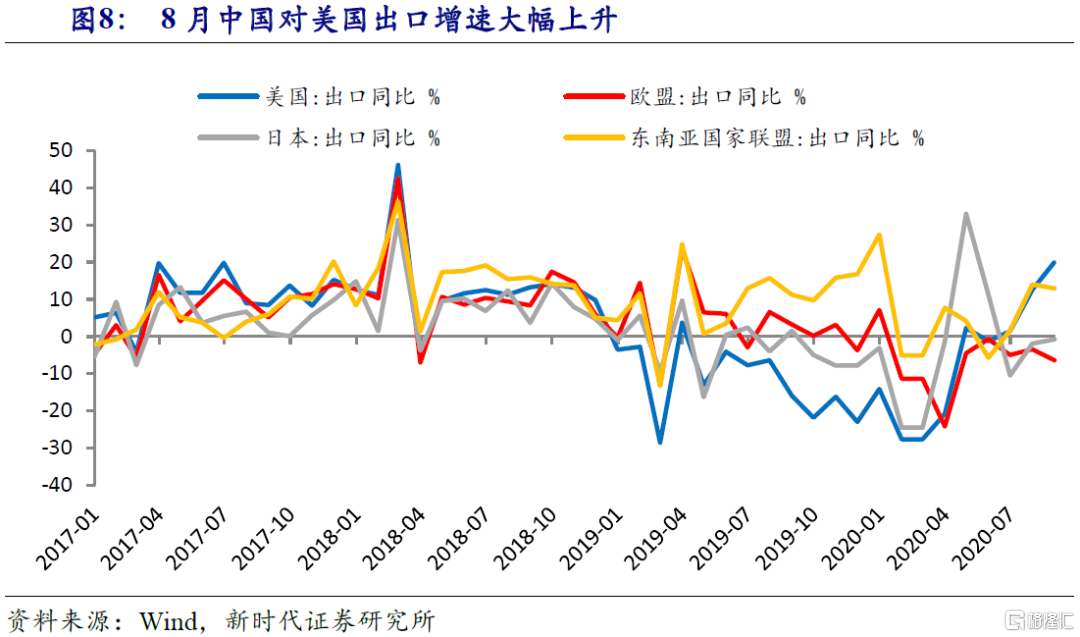 8月美元计价出口金额同比增长9.5%,超出市场预期,这主要得益于海外经济复工复产,生产生活物资需求增加。分区域来看,中国对美国的出口增速大幅上升,但对欧盟、东盟的出口增速有所回落。其中,对美国的出口增速上升至20.0%,较前值上升7.5个百分点,对欧盟出口同比下降6.5%,降幅有前值(-3.4%)扩大,对日本出口同比下降0.8%,降幅由前值-2.0%收窄,对东盟出口同比上升12.9%,增速较前4.0%小幅回落。出口增速与全球制造业PMI的修复一致,摩根大通全球制造业PMI升至51.8%,较前值上升了1.2个百分点,欧元区制造业PMI、美国ISM 制造业PMI分别为51.7%、56.0%,都超过50%,全球经济进入同步复苏状态。与对欧美出口增速分化相一致,欧元区制造业PMI相较前值有所回落,欧洲复苏弱于美国,这主要是由于美国疫情再次好转,而欧洲疫情恶化,同时,美国财政救助力度较大,美国居民可支配收入和居民消费恢复较好。