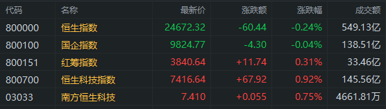 上午盘主要指数震荡走低,科技股表现较强,恒生科技指数涨0.92%,恒指跌0.24%报24672点。南下资金半日净流入18.55亿港元,大市成交额为549亿港元。