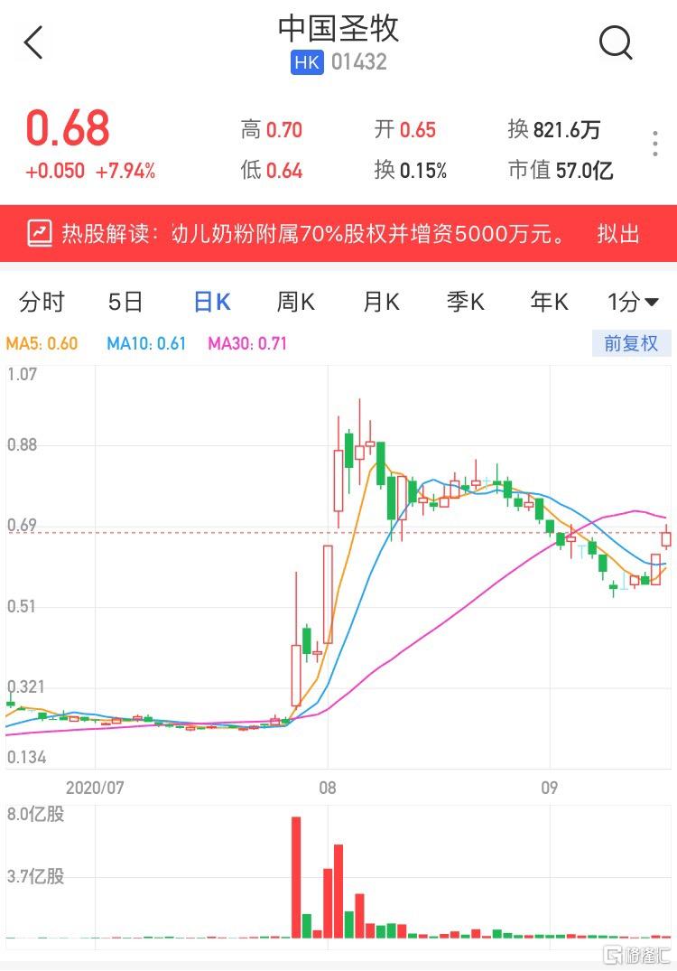 格隆汇9月16日丨昨日大涨12.5%的中国圣牧(1432.HK)今日续涨,暂两日连升累涨超21%,现报0.68港元,涨7.94%,暂成交821万港元,最新总市值57亿港元。中国圣牧上周五(11日)晚间发公告称,公司全资附属圣牧高科、大北农集团及目标公司订立股权转让及增资协议,据此,圣牧高科拟向大北农集团出售目标公司内蒙古益婴美乳业70%股权,同时大北农集团将向目标公司增资民币5000万元。该等交易完成后,目标公司将由大北农集团及圣牧高科分别持有80%及20%。