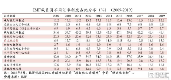 2009~2019年,在这10年中,实行硬盯住汇率制度,也就是固定汇率制度的国家,占比在提高,从12.2%提高到12.5%。而实行软盯住汇率制度,我们可以把它理解为类似我国的有管理的浮动汇率制度,占比从2009年的34.6%,提高到了2019年的46.4%,提升了接近12个百分点,说明采取类似我国的汇率制度的国家已越来越多,也表明“清洁浮动”不一定优于非“清洁浮动”。