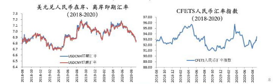 以下左图是美元兑人民币在岸、离岸即期汇率。最近一段时间,美元贬值较多,人民币升值较快,这一变化和美元指数本身有关系。而人民币最近的升值不单单是对美元的升值,因为人民币汇率指数本身也在上升,汇率指数是通过一篮子货币计算出来的,说明人民币对全球的主要货币都处于一个升值趋势。