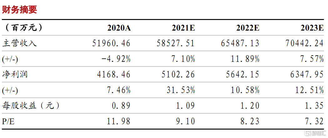 预计公司21-23财年实现营业收入585.3/654.9/704.4亿元(+7.1%/+11.9%/+7.6%),归母净利51.0/56.4/63.5亿元(+31.5%/+10.6%/+12.5%),对应PE为9.1X/8.2X/7.3X,考虑到公司盈利具有较大的向上弹性且目前估值显著偏低,给予“买入”评级。