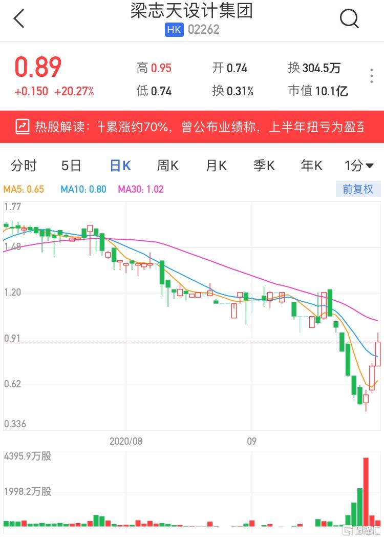 格隆汇9月30日丨梁志天设计集团(2262.HK)今日续涨,本周暂三日连升累涨近80%,现报0.89港元,涨20.27%,最新总市值10亿港元。梁志天设计曾发布今年中期业绩公告称,期内实现收入1.87亿港元,利润为640万港元,扭亏为盈;每股盈利0.53港仙。公告还称,即使房地产市场放缓,其对室内设计服务的需求并无重大影响。尽管遭到COVID-19的影响,集团于2020年上半年展现了韧性。集团于期间的新签合同数量水平保持稳定,亦能于提供优质室内设计服务的同时维持稳定的毛利率。