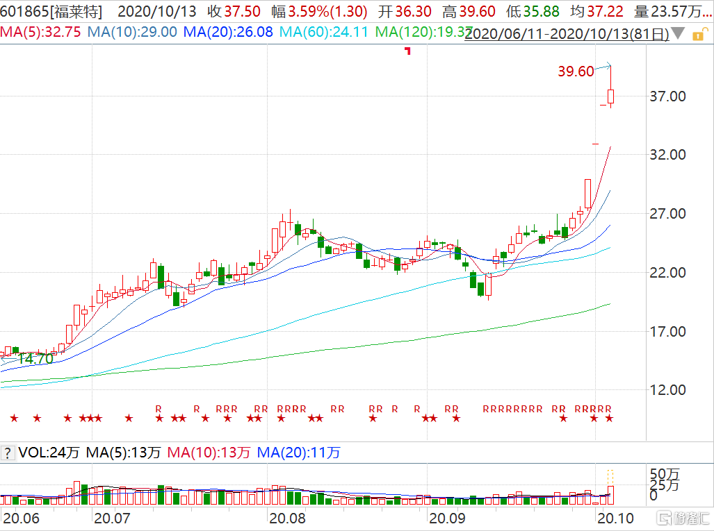 格隆汇10月13日丨连续三日涨停后,福莱特(601865.SH)今日盘中再度逼近涨停再创历史新高价39.6元,目前涨幅收窄至4%以内。公司为国内领先的光伏玻璃龙头企业,年内股价累涨超200%。受益于2020年最后的抢装季,近期光伏新增装机量大增,进一步刺激光伏玻璃需求增长。据悉,公司10月份的3.2mm报价为35-36元/平米,环比上涨15%以上。光伏玻璃涨价主要原因是供不应求,即光伏下游组件等扩产较多,而光伏玻璃新建产能因政策受限。业内预计光伏玻璃供应紧张或持续到2021年。