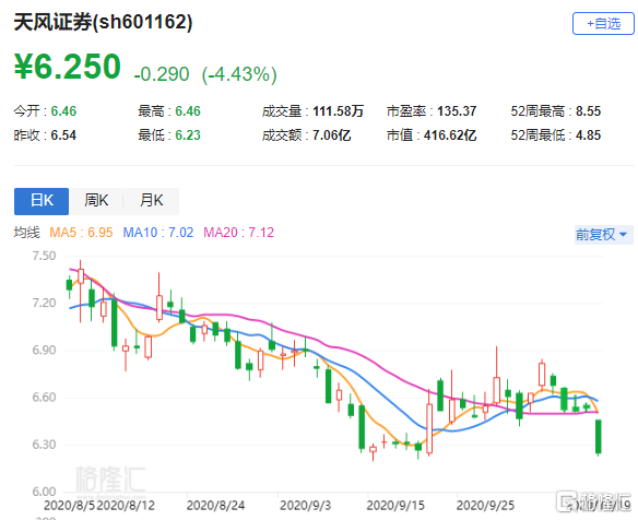 格隆汇10月19日丨天风证券(601162.SH)低开持续走弱,现跌4.43%,报6.25元,成交额放大至7.06亿元,总市值416.62亿元。天风证券10月16日晚公告,股东湖北省联发计划在未来6个月内减持不超1.56亿股,占公司总股本的2.34%;股东当代科技拟计划减持不超4450万股,占公司总股本的0.67%。值得一提的是,公司在9月底抛百亿定增,上市后短短两年内已经进行了三次补血。