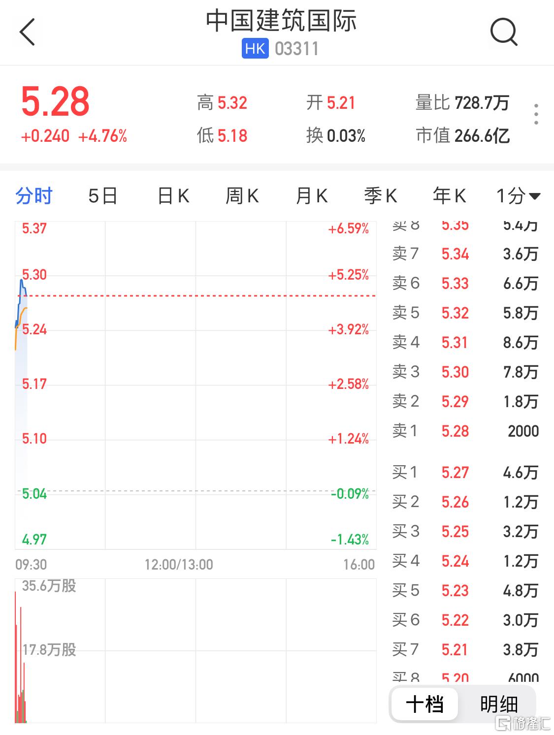 格隆汇10月20日丨中国建筑国际(3311.HK)高开高走,现涨4.76%,报5.28港元,总市值266亿港元。